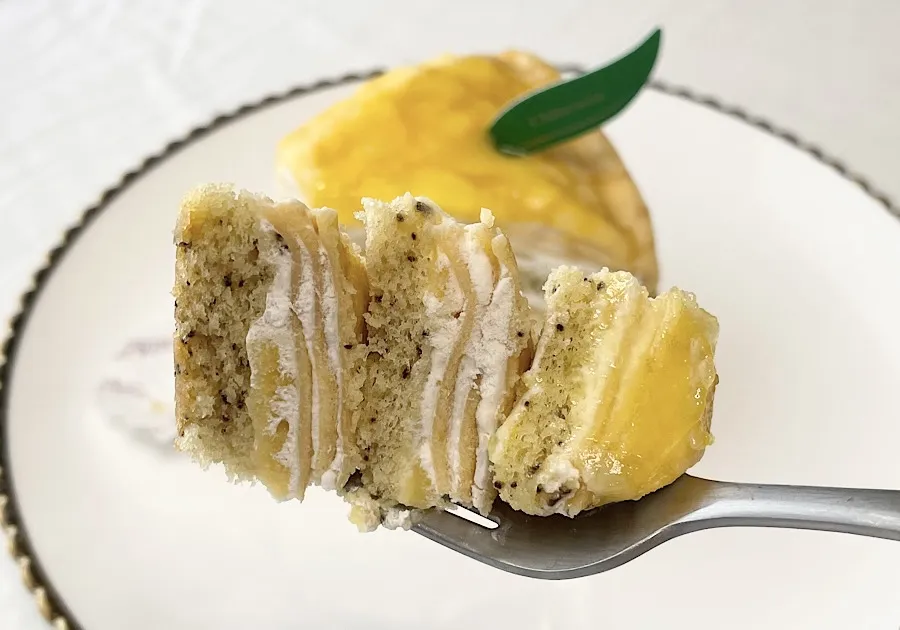 紅茶とレモンの味わいを感じつつ、クレープ生地が何層も重なった口どけは、ミルクレープ好きにはたまりません。食べた瞬間、レモンティーを飲んでいるようなスッキリとした風味が新鮮。食べるたびに幸せな気持ちな気持ちになります。レモンカードにはレモンの果皮が入っているため、果皮の食感がアクセントに。瀬戸内レモンと紅茶の、上品な甘みを存分に堪能できる期間限定品です。