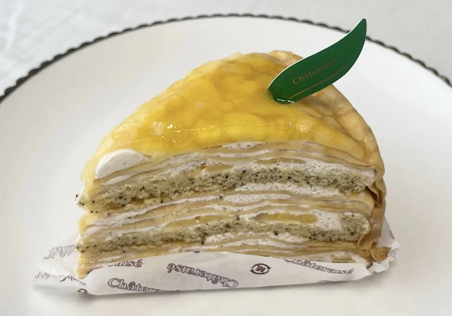最後に紹介するのは「瀬戸内レモンと紅茶のクレープケーキ」。瀬戸内のレモンと、ダージリンとアールグレイの2種類の紅茶を使用。たまごの風味豊かなクレープ皮と、アールグレイの茶葉入りのスポンジ、ダージリンを使用した紅茶クリーム、甘酸っぱく濃厚なレモンカード(レモン、砂糖、バター、たまごなどを使って作る、イギリス発祥のジャムのようなもの)をサンド。”レモンティーの味わい”をイメージして作られたケーキなのだそう。
