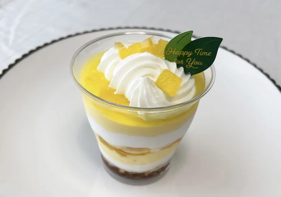 最初に紹介するのは「瀬戸内レモンのカップデザート」。レモン生産量日本一の瀬戸内産のレモンの果汁と果皮が使用されています。レモンクリーム、レモンソース、レモンゼリー、ホワイトチョコでコーテイングしたアーモンドクランチ、桃風味クリームを重ねて作られているのだそう。