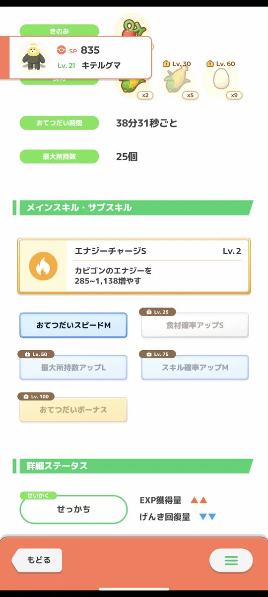 月曜日はイーブイだったが、火曜日以降はエーフィに進化した。手持ちのメインスキルのタネをひとつ使い、メインスキルのレベルが5になっている。 一応、簡易的にきのみ、スキル、食材で持ってくるエナジー指数を計算してみたところ、 上記のライチュウの個体 9.44 このエーフィスキルレベル4 11.7 上記のフシギバナの個体 13.0 上記のメガニウムがLv30になったとき 15.27 このエーフィのスキルレベル6 17.2 となった。ライチュウより高いのでメインスキル4のまま編成する意味はあるが、やはりメインスキルLv6のエナジー獲得量は目を見張る者がある。メインスキルのタネはできればサーナイトのためにとっておきたいところではある。他のフィールドならデンリュウの方がエナジーチャージMとしては優れているのも、これから全体的にレベルが上っていくとインフレについていけなくなるところも悩みどころ。 計算に使ったスプレッドシートhttps://docs.google.com/spreadsheets/d/1GC5sBbjoVW_8uZhFDoX2UfDhsmzGLWzkKA4k2z8IXro/edit?usp=drivesdk ※raenonxさんのポケスリ攻略がエナジーチャージMに対応、簡単かつより正確にシミュレーションできるようになった。エナジーの大小関係はだいたいあってたっぽい。