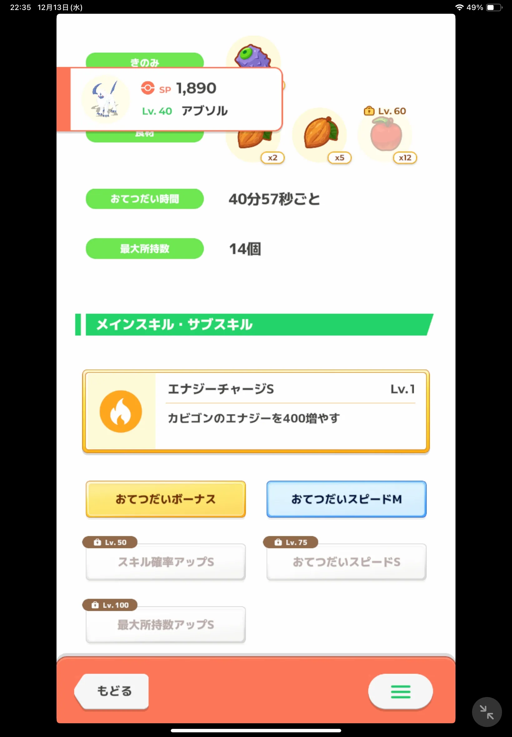 アブソルは進化しないのでメインスキルのレベルを上げるためにはメインスキルのたねが必要です。