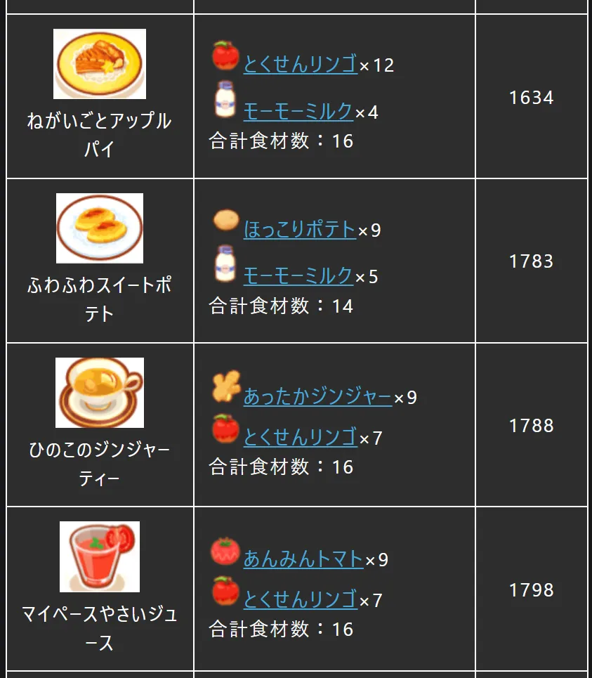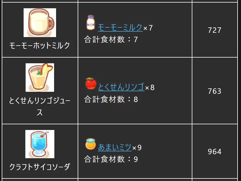 | 私のパーティのメイン食材はカメールが集めるミルクとアリゲイツ2匹が集めるミート。となると、各カテゴリでねらい目となる料理は上の通りなのですが、明らかにデザート・ドリンクだけエナジーが劣っている・・・。余った食材を鍋にぶち込めばいいのですが、それでも他の料理よりはエナジーが劣ります。 | |||