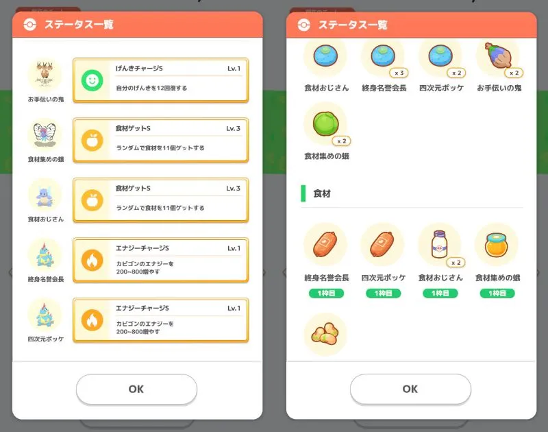 もちろんドードリオとアリゲイツも食材(豆と肉)を集めてくれますし、カメールは食材タイプなので、スキル以外でもミルクを2個ずつ集めてくれます。きのみ・料理ともに完璧なメンツ、という想定でした。
