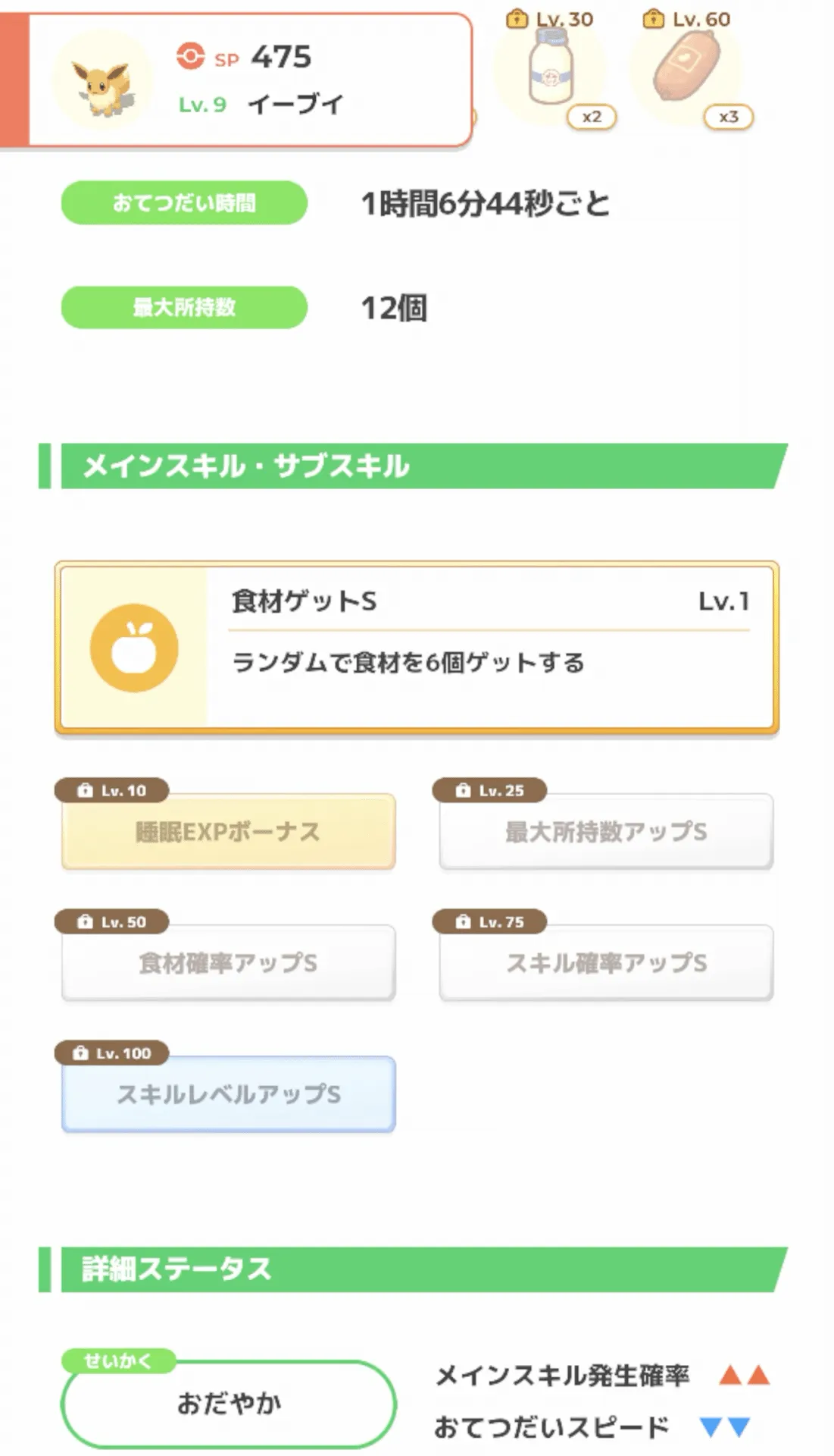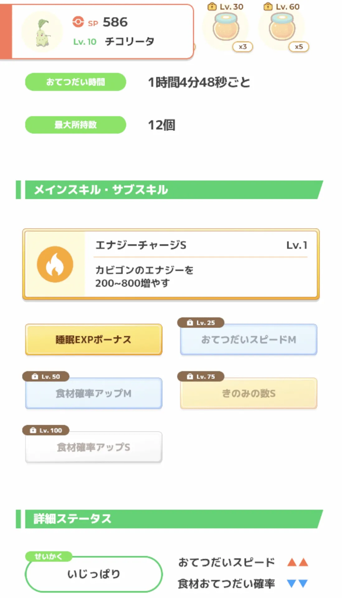 評価:★★★☆☆Sだが食材アップ持ちで睡眠EXPボーナスも嬉しい。性格がイマイチなのだが、とりあえず確保しておく1匹目としては悪くないのではないだろうか。