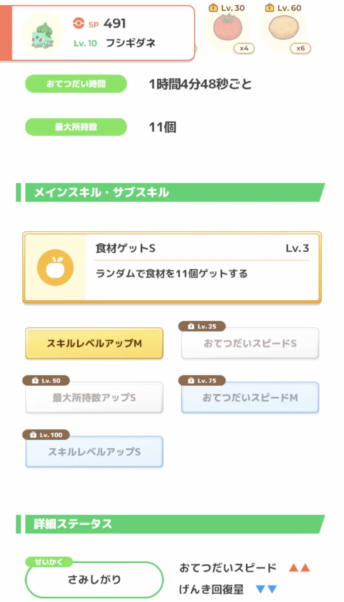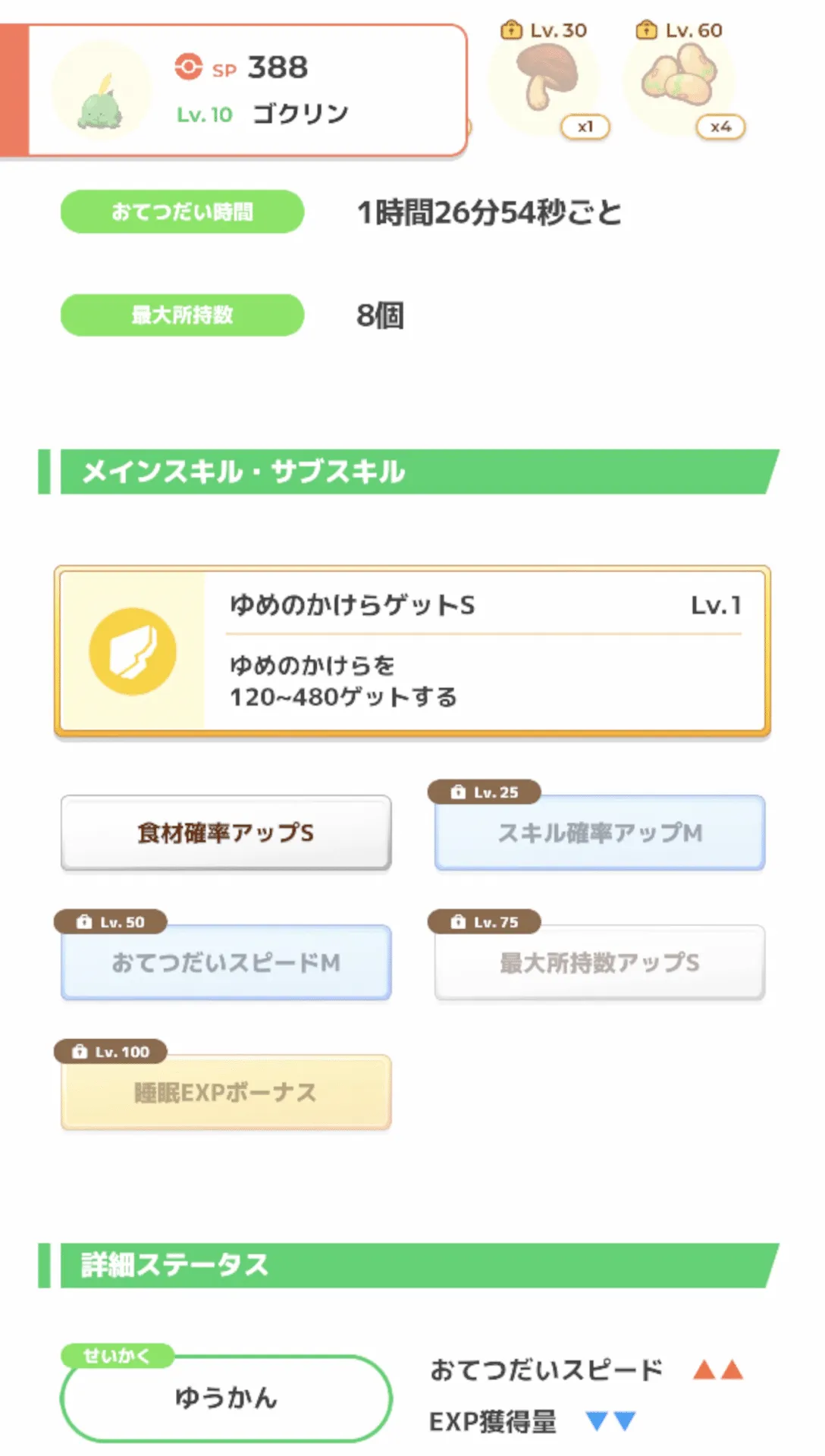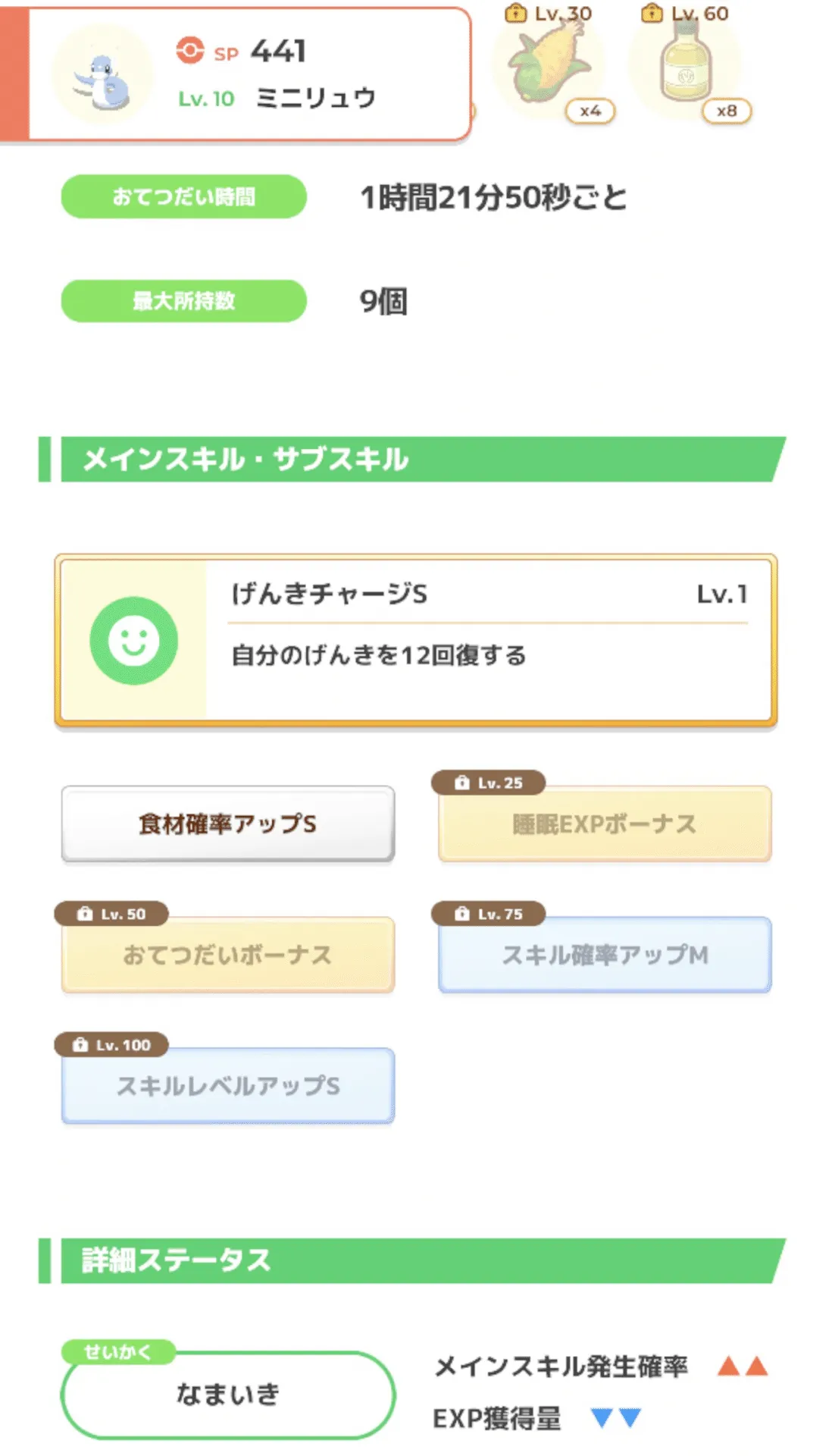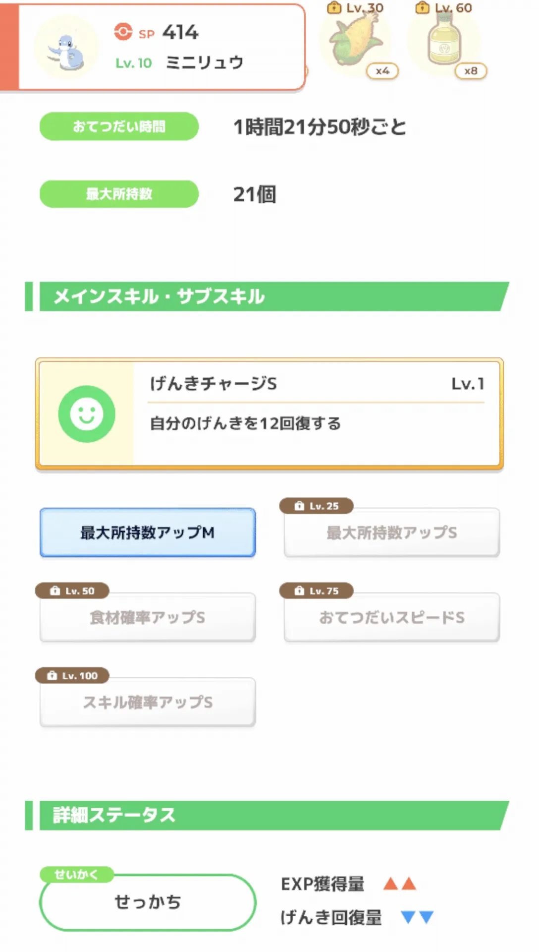 食材確率アップMとおてスピSと食材得意に欲しいものが揃っている。性格の下げ補正も無く、いい個体なのではないだろうか。当面はコーンの欲しい時に編成して使おうと思うのだが、そのうちレベルが上がっていってなんやかんやでスタメンになりそう。