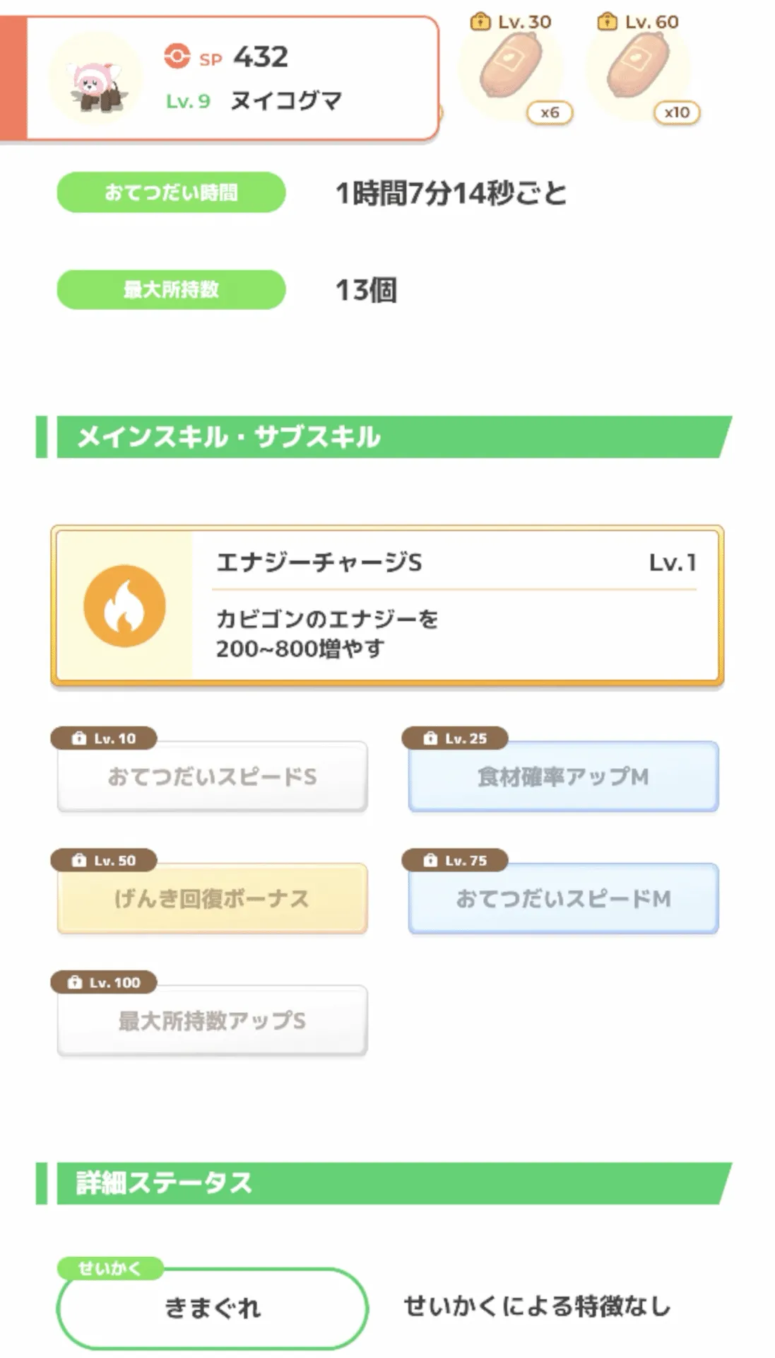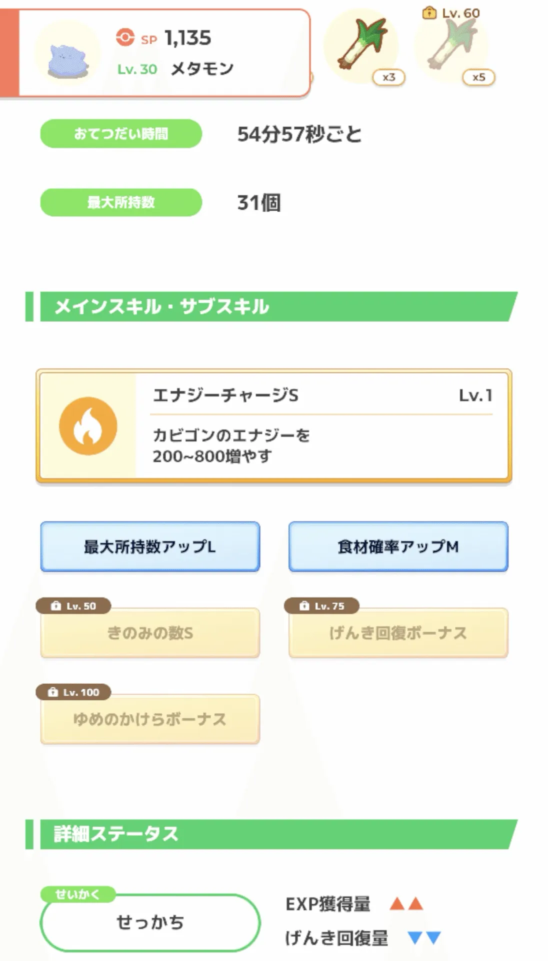 評価:★★☆☆☆睡眠EXPボーナスを編成するときはだいたい週の終わり頃にもうエナジーがいらないので手持ちポケモンに経験値を振りたいというときだ。基本何でもいいのだが、欲を言えば食材得意の方が嬉しい。週の終わりは食材を貯めて次週に備えたいからだ。要するに、きのみ得意で食材確率下げなのはあまり良くないのだ。