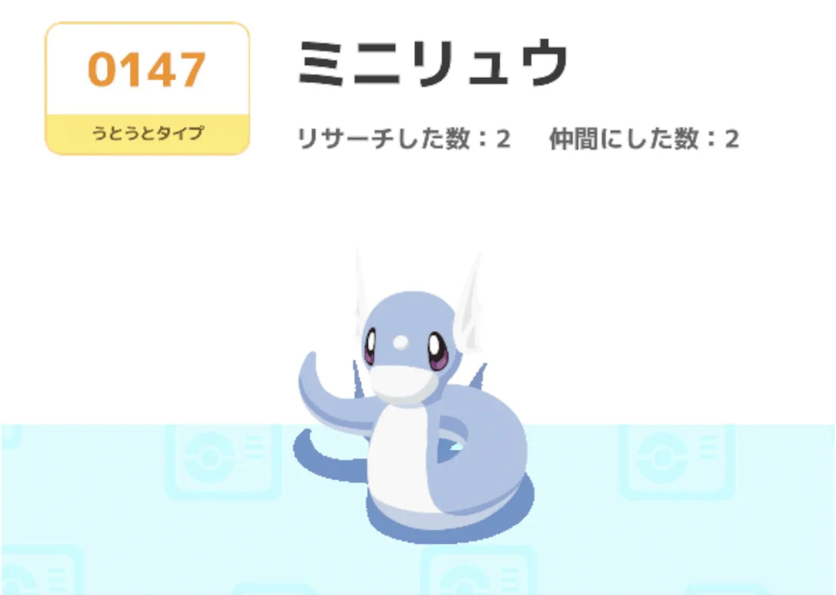 ウィークリーミッションのマスター2到達以降はまったり進行で食材を温存した。 イベント対象のワカクサ本島で湖畔の新ポケモンを狙っていく。 ここで一旦新ポケモンの性能を確認しておこう。 新ポケモン一覧 ミニリュウ 得意:食材(ハーブ・コーン・オイル) 欲しい度:★★★★★ 新食材であるワカクサコーンをLv30に持つ食材得意ポケモン。 ハーブ・コーンの組み合わせはれんごくコーンキーマカレーで必要になる他、単純に素点が高い組み合わせであるため食材エナジーの獲得に役立つ。 レベルアップに必要な経験値が他のポケモンより多く、現時点でバンギラスと並んで育成がしんどい。 厳選基準 食材確率 1