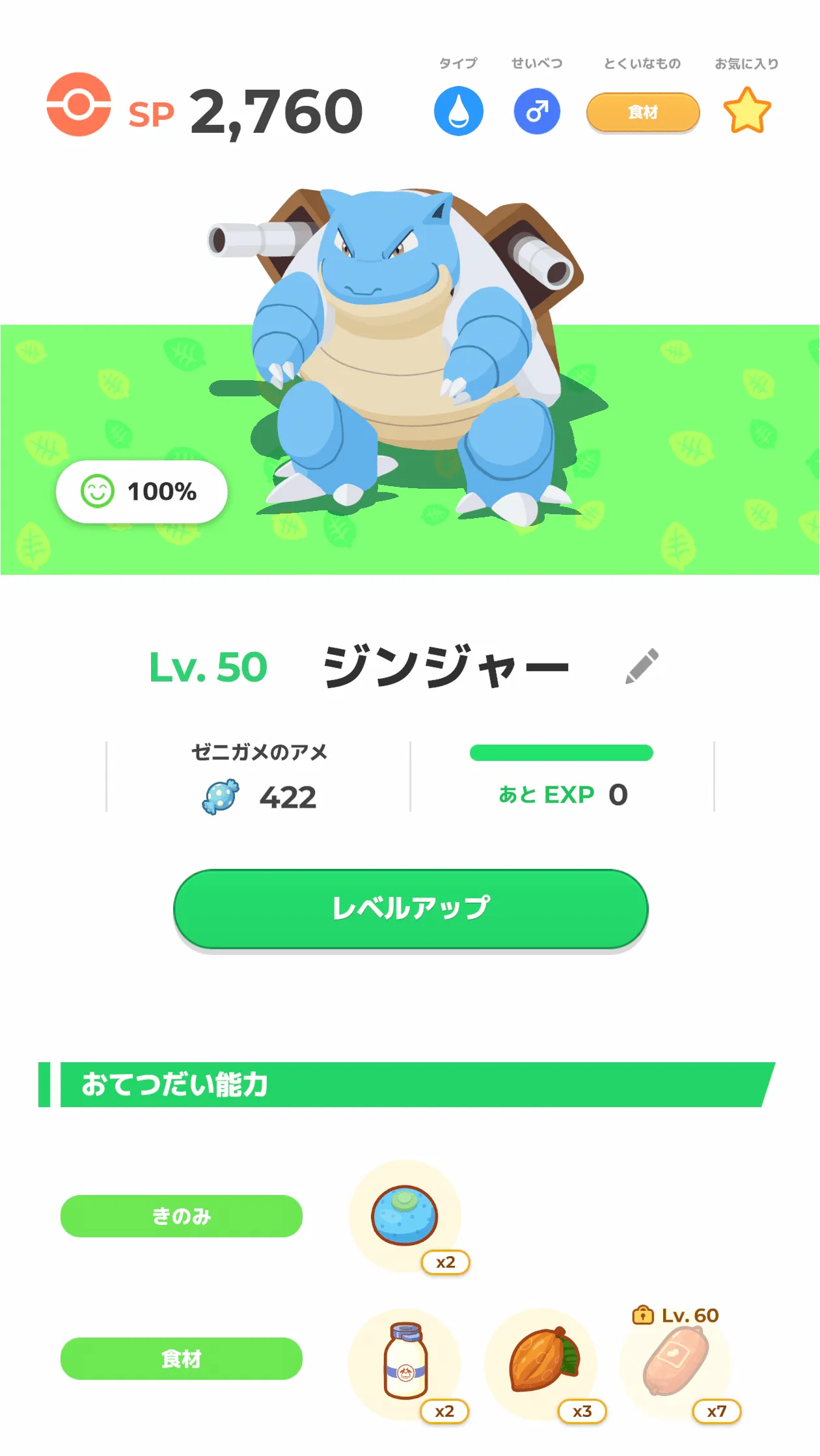 レベル50! カメックスがめでたくレベル50を迎えたので、使用感や食材得意ポケモンの所感をまとめ。 と思ったらレベル55までの解放が発表されてしまった。 食材編成をまとめていたらラピスラズリ湖畔の追加が発表されたりと間が悪いですね。 スペック 睡眠に良さそうな名前にしたらゲーム中にジンジャーが出てきてしまったEXP獲得量アップは特に攻略初期で有効 ゼニガメ期 ポケモンスリープの始めたてということもあり、ピカチュウも常駐でリンゴと合わせて料理を回していた記憶。 カレーとデザートはミルクのみで作れるレシピがあるため、ゼニガメで多くの週のレシピをカバーすることができました。 サラダのみ対 2
