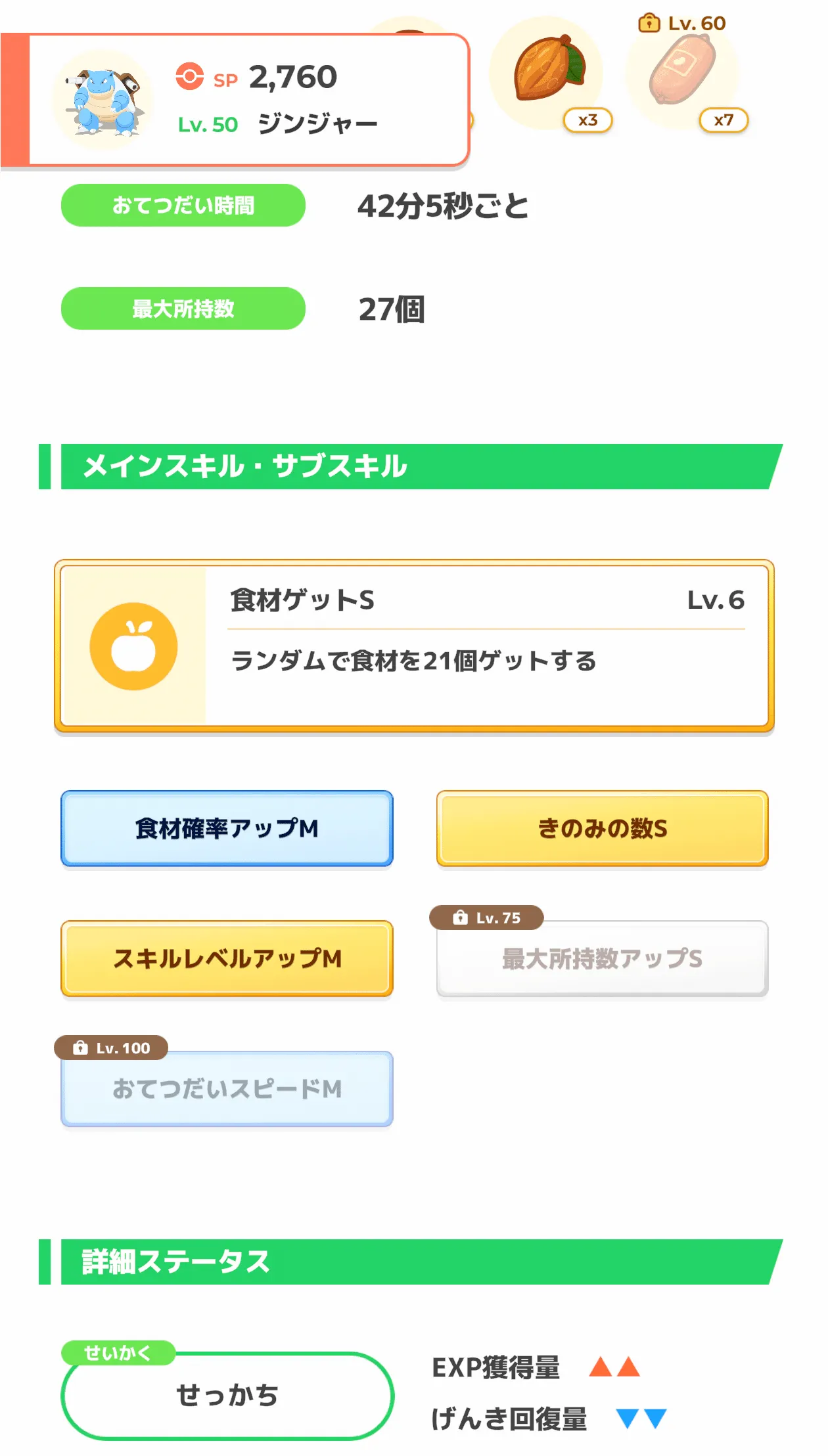 このカメックス、サブスキルに「食材確率アップM」を持っていますが、やはりレベル50に至るまで活躍できたのはこのサブスキルの恩恵が大きいです。食材得意ということならもちろん食材の獲得を期待するのですが、このサブスキルひとつで大きく使用感が変わってきます。二枠目の食材を期待するならなおさら。更にカメックスは二枠目のカカオが一回に3個とかなり少ない部類なので、より恩恵が大きいです。(参考に、同じ3個ならダグトリオのながねぎ、同じカカオならアブソルの5個)基本的に二枠目の食材で戦うなら必須のサブスキルと言っても過言ではないですね。ただし、一枠目と二枠目で同じ食材を持ってくるなら(れんごくコーンキーマカレーなどを作るなどしない限りは)余裕を持って食材を調達できるので別の役割を持たせることもできます。たとえばミツフシギバナにスキルを期待したり、ミートリザードンにきのみでのエナジーを期待したり⋯等。食材得意なポケモンを育てる際は一度そのポケモンが活躍するシーンをはっきりイメージができてから育成ができるといいですね。一律にエナジーが上がっていくきのみ得意やどうしても運が絡むスキル得意にはない、役割にビタッとはまる気持ちよさは食材得意なポケモンならではです。
