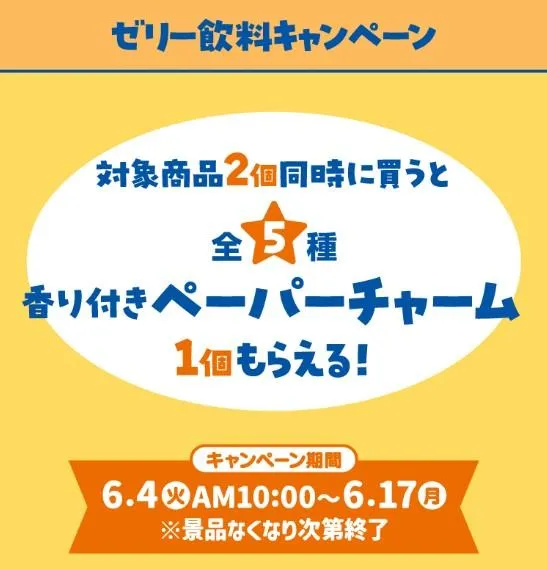 6月4日10時から17日までの期間に対象商品を2個同時に購入すると、全5種の「香り付きペーパーチャーム」が1個もらえます。購入する際は、対象商品と好きなペーパーチャームを一緒にレジまで持参してください。無くなり次第終了です。