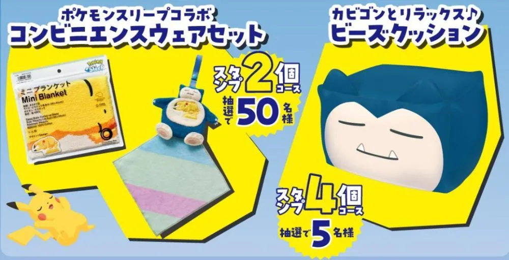 【特典】・スタンプ2個コース…ポケモンスリープコラボ コンビニエンスウェアセット(抽選で50人)・スタンプ4個コース…カビゴンとリラックス♪ビーズクッション(抽選で5人)【開催期間】 6月4日0時から24日23時59分まで【応募期間】 6月4日0時から28日23時59分まで