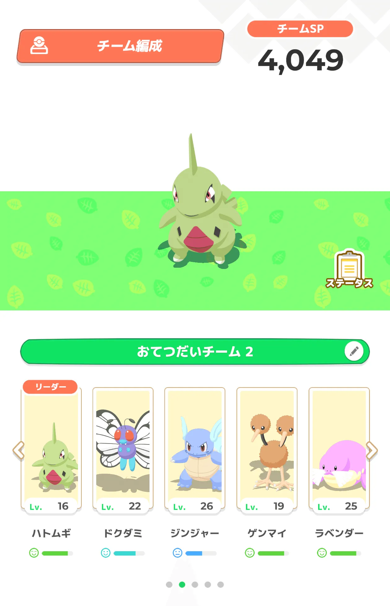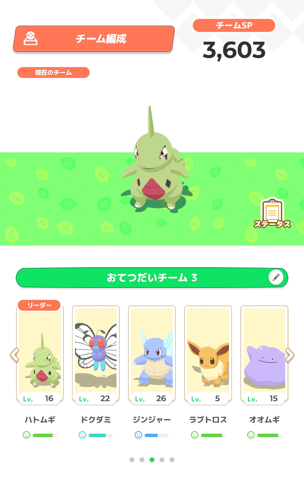 引き続きデザート・ドリンク週のためマラサダ狙いの編成。洞窟向けのいい感じのポケモンがいないのでいったん食材偏重で。トドグラーから先週仲間になったメタモンにチェンジし、オイルの安定供給を狙います。さらに満月の経験値ボーナスを頼りつつ睡眠時間を稼ぐためにニンフィア候補のイーブイを編成。カメールがあと2つほど寝ると進化できるレベル27になるため、満月のタイミングでヘラクロスなど経験値の稼ぎづらいポケモンにバトンタッチしたい。