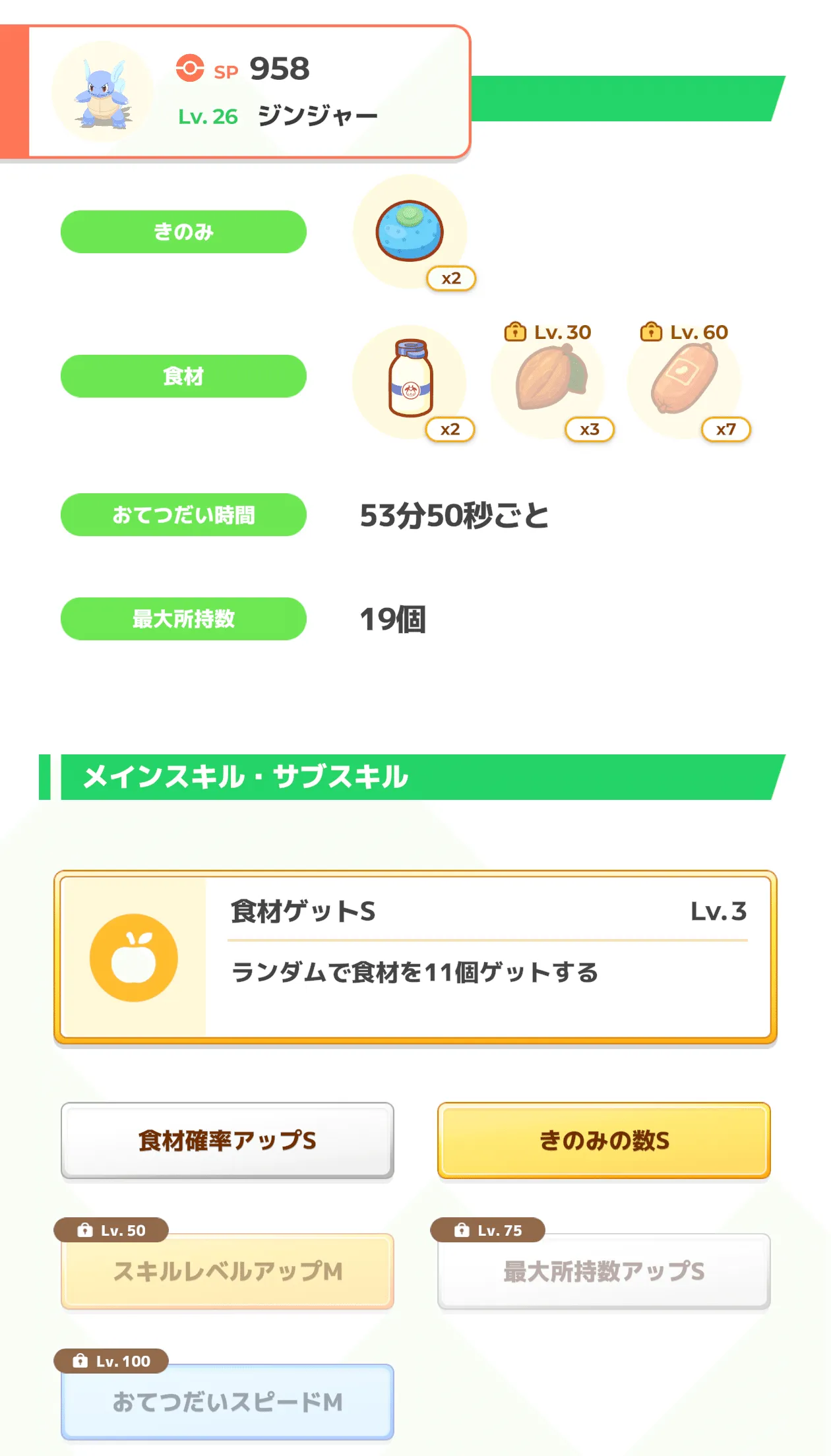 スタミナが保たないので昼にはもう渋い顔をしてる 初めて手に入れたというだけでずっと編成していますが、スキルも悪くなく食材もカカオ内定となかなかいい感じ。げんき回復量downが痛いがいざというときはまくらやおこうでカバーだ。メインスキルのたねも食わせた食材ゲットSと合わせて我が家の食材の柱として活躍しています。進化とスキルレベルアップMも合わせた獲得食材がどれだけになるか楽しみですね。