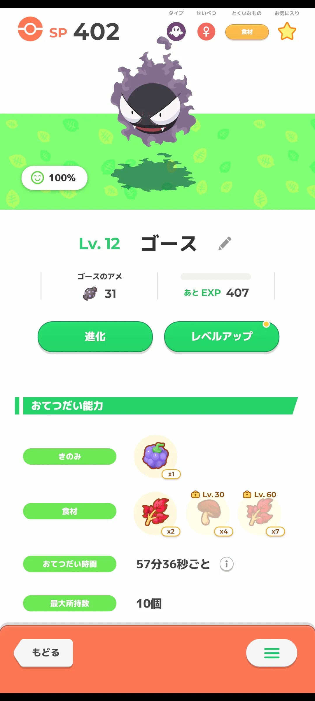 このゴースの場合、レベル30であじわいキノコ、レベル60でげきからハーブを拾ってくる個体だから、目当ての食材でなければ、もう一度捕まえる必要があるよ!!