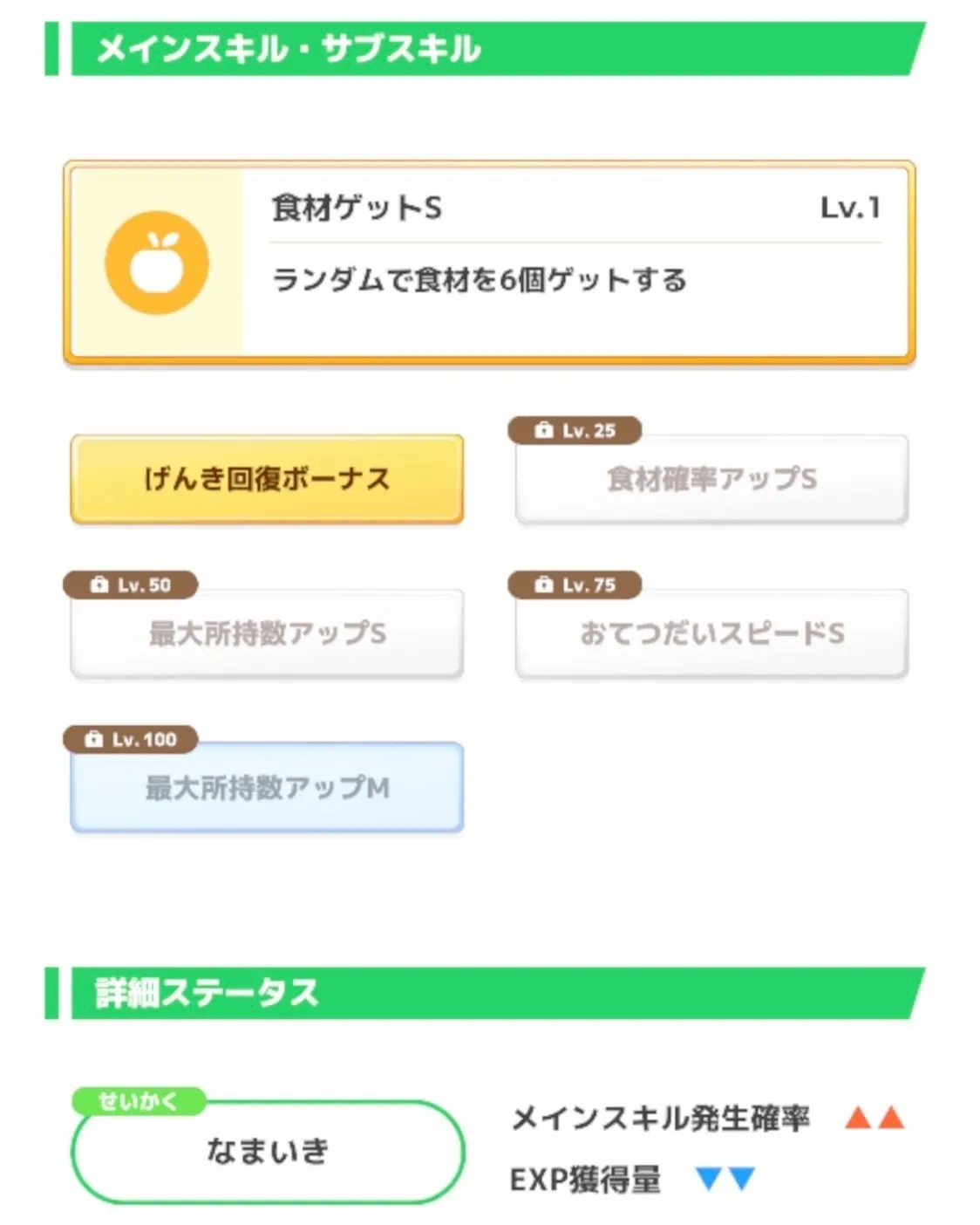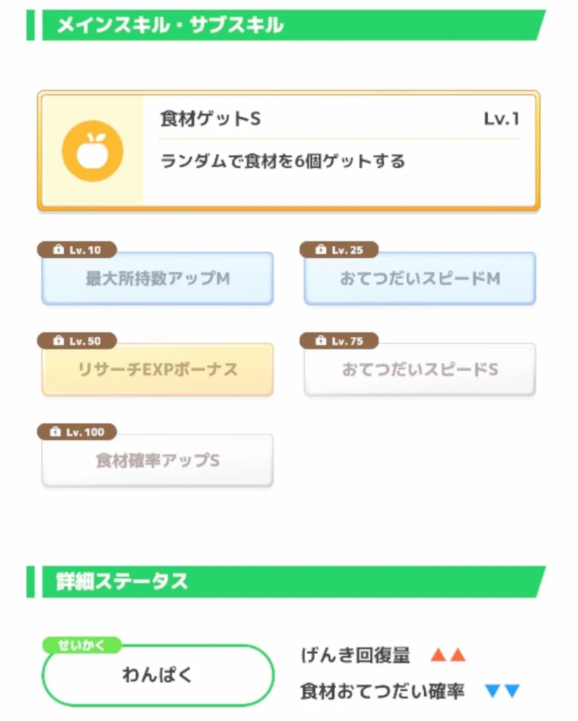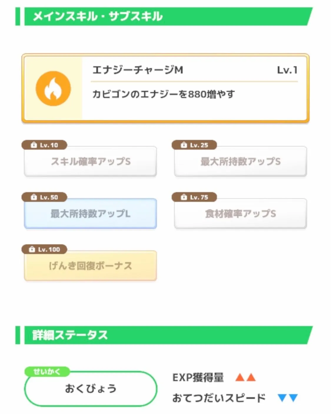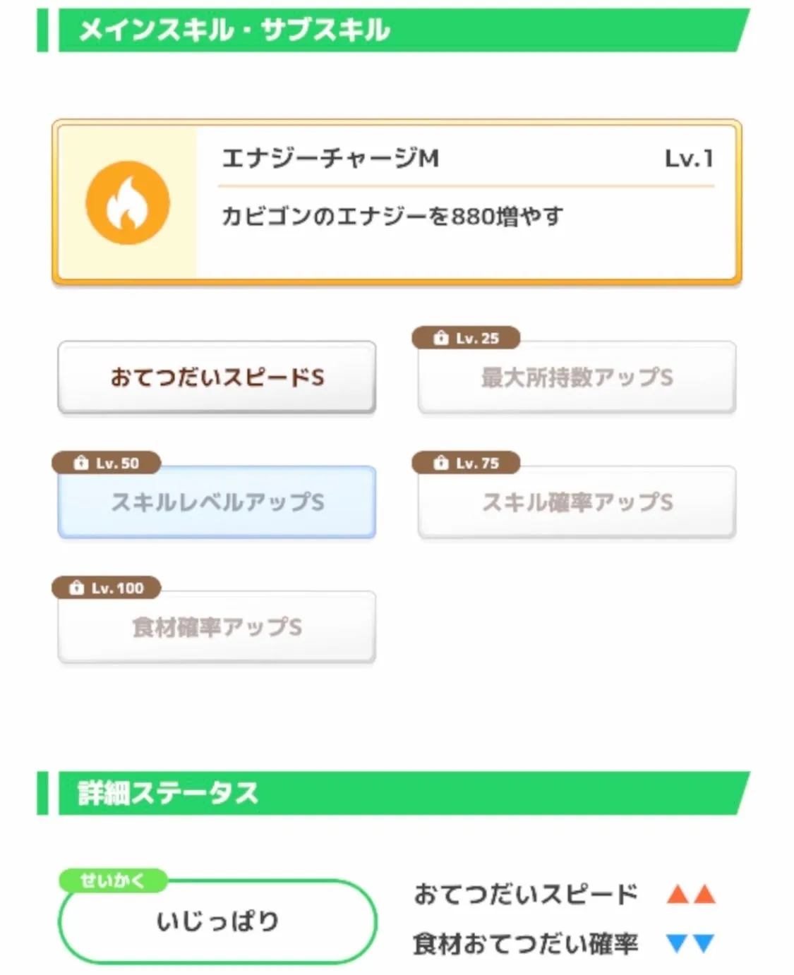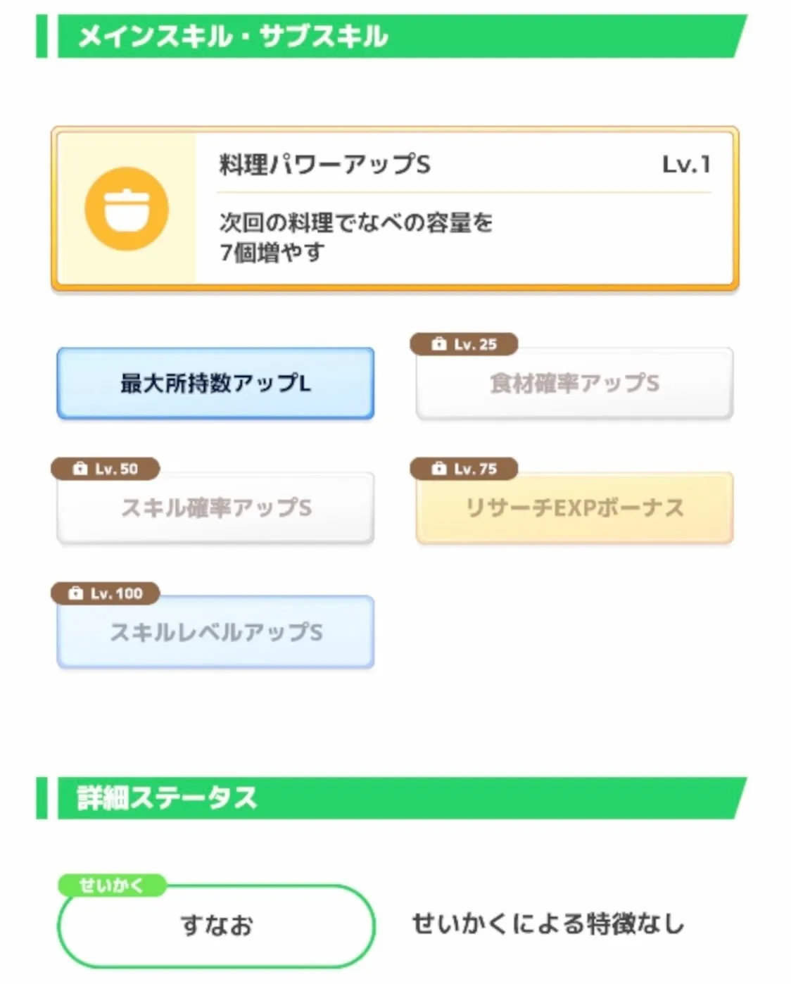 たとえばピカチュウなら素のスペックが高い(おてつだいスピードがめちゃくちゃ早い)ので、少しくらい性格やサブスキルが思ってたのと違ってもそれなりに活躍します。 うちの初期ピカチュウ(リセマラしてない)はきのみの数Sはついていますが、レベルキャップ解放されないと使えないところにあるので、実質《きのみの数Sなし》です。食材⤴️の性格とサブスキルがあるので、リンゴやショウガをよく持ってきます。スキルレベル⤴️でピチューから進化してないスキル効果のデメリットを相殺し、スキル確率⤴️で地味にエナジーを稼ぎます。つまり、なんでもそこそここなせるんだ。RPGの主人公キャラみたいな。初期からほぼずっと編成に入ってるからレベルが高いため、編成メンバーに困った時にとりあえず入れておけばそれなりの働きを見せる便利キャラとしての役割が生まれました。 まあ、ピカチュウ類はもう初期ピカチュウが育っちゃってるから、色違いでも微妙個体なら出番はないかな!(ああ無情)