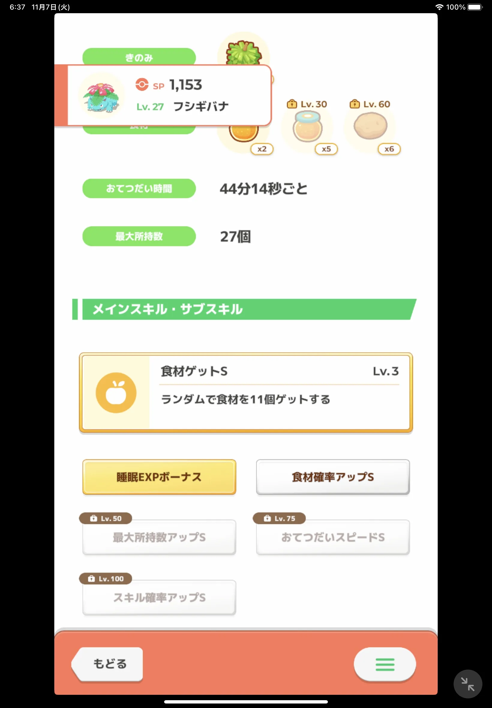 | なので厳選するのであればフシギダネ一択です。フシギバナになる頃には最大所持数が27(サブスキルの恩恵なしの場合)になります。 | ||