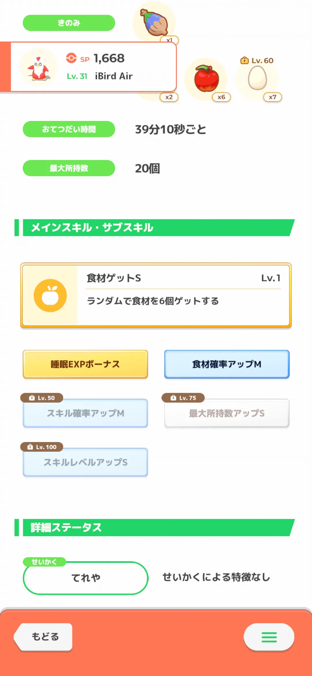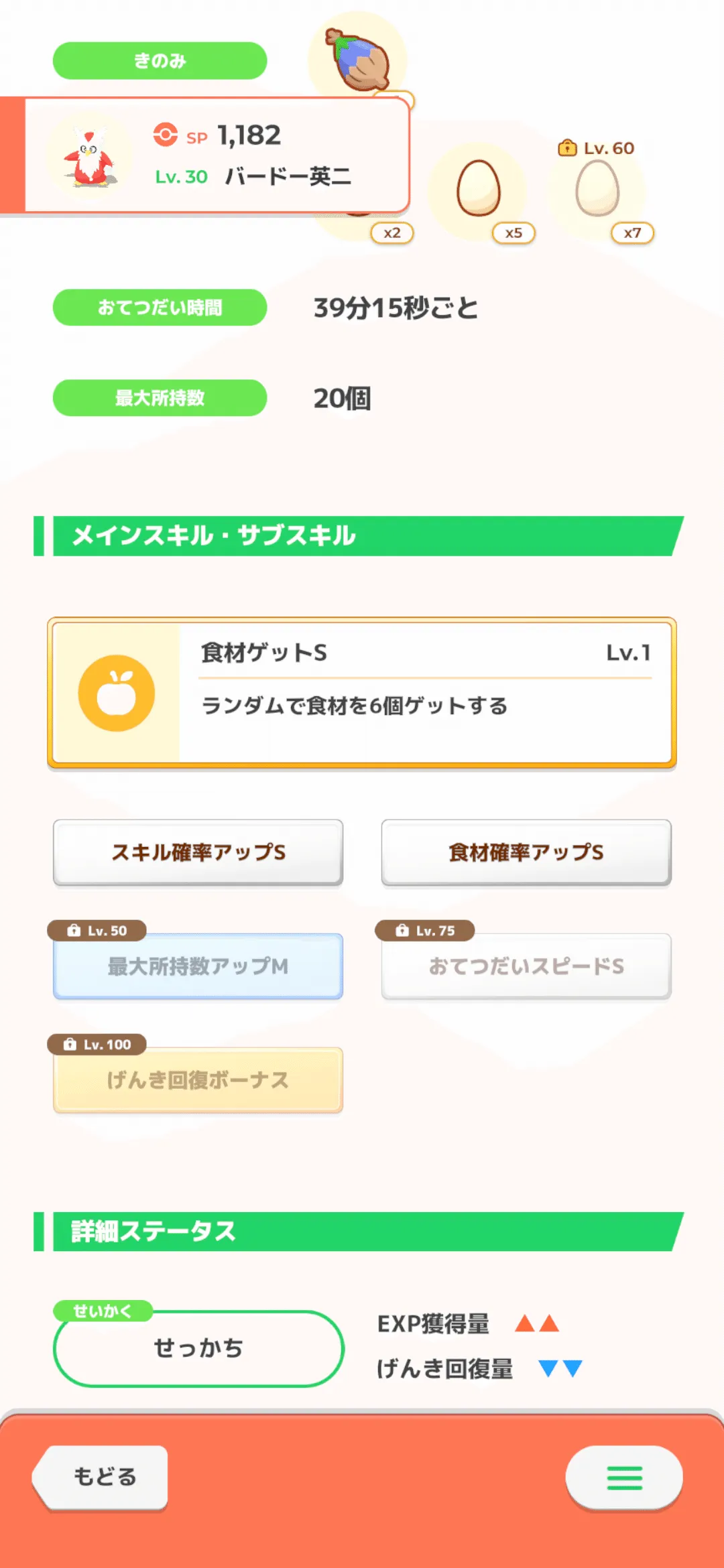 メインスキルの食材ゲットSについては確率が低く1日1回発動すればいい方でスキルレベルも1のため計算には入れない方がいいでしょう。