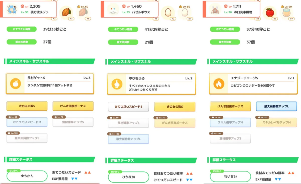 ちなみに私の個体たちだとミルクが微妙に足りず、3食に1回くらい作れなくなる予定です。なのでカメックスは食材確率が上がるサブスキルやせいかくがあること推奨です。