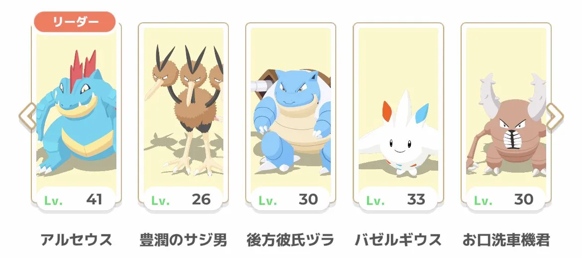 重要なのは後ろ3匹 ではシアンの砂浜のデザート・ドリンク週をどう攻略するかですが、私はこのようなチームを組みました。ニックネームついているのでわかりづらいですが、ポケモンごとの役割はこんな感じ。