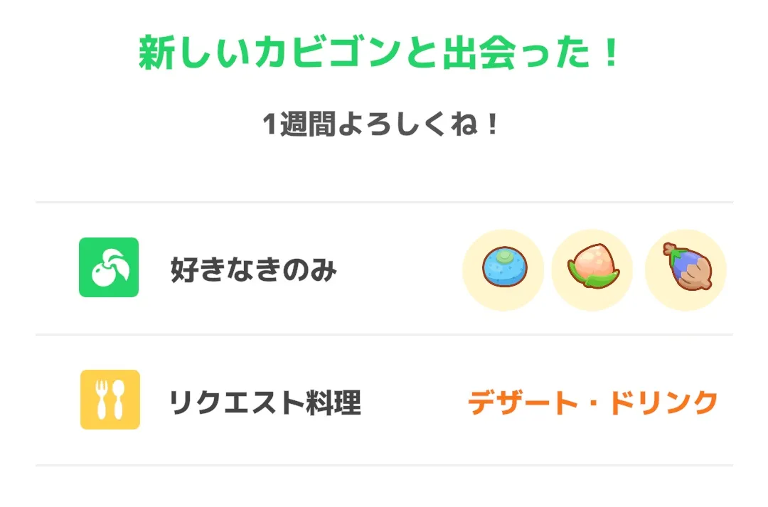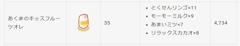 卵が集まってほかの食材も余裕があればこれを狙う デザート・ドリンク週にそこそこ安定してエナジーを稼げる料理は「あくまのキッスフルーツオレ」なのですが、必要な食材4種類をカメックス(ミルク・カカオ)とカイロス(ミツ・リンゴ)の2匹でカバーできます。2匹で回せるなんてなんとコスパがいいこと。