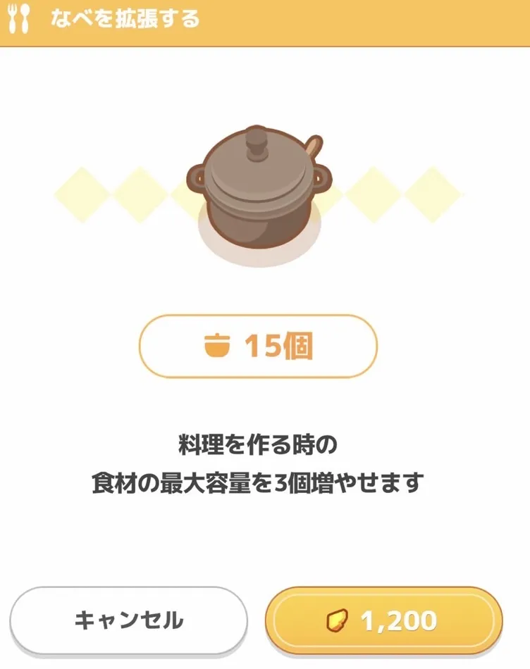 料理の中には食材が16個以上必要なレシピもあるため、鍋の拡張を行って容量を増やしましょう!