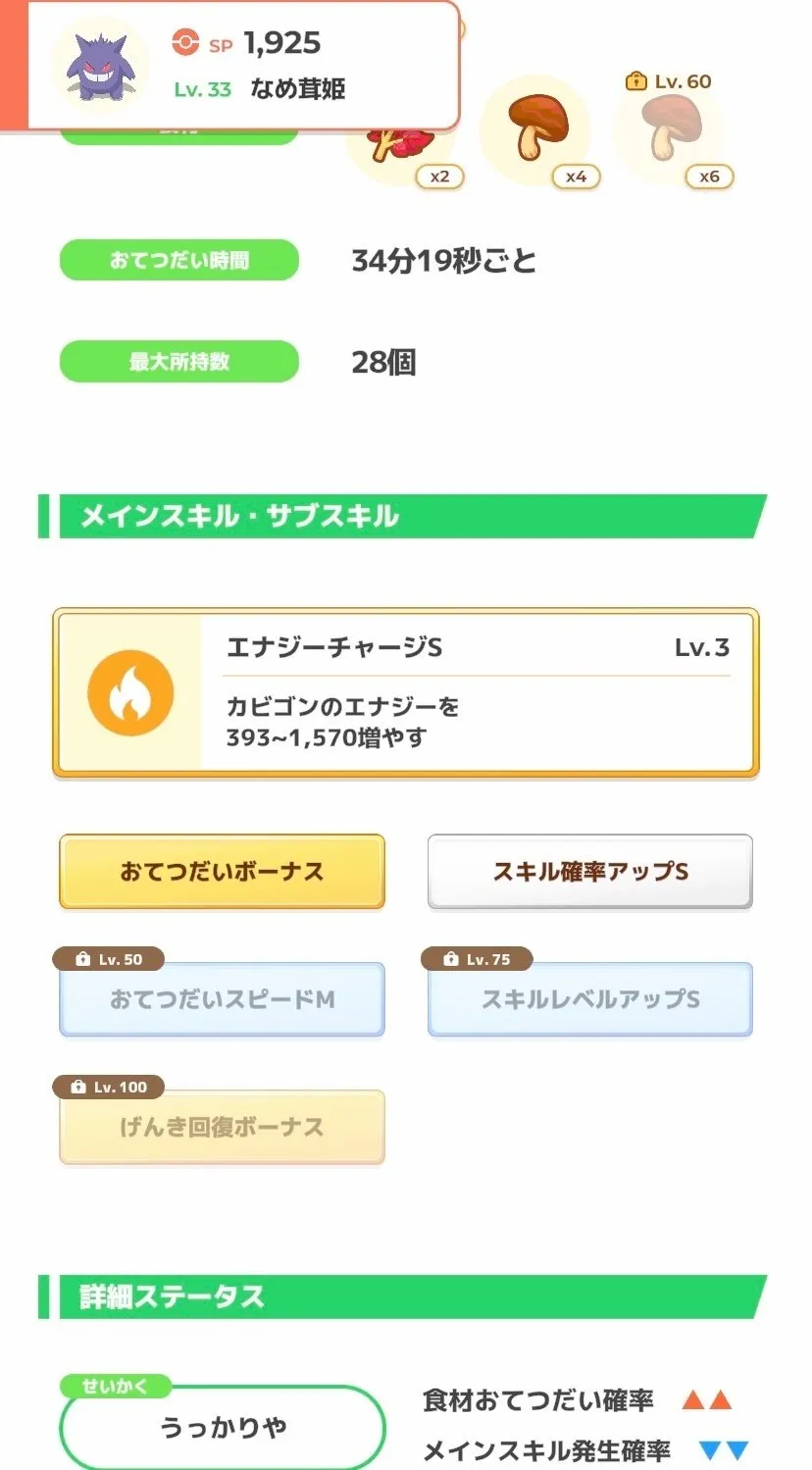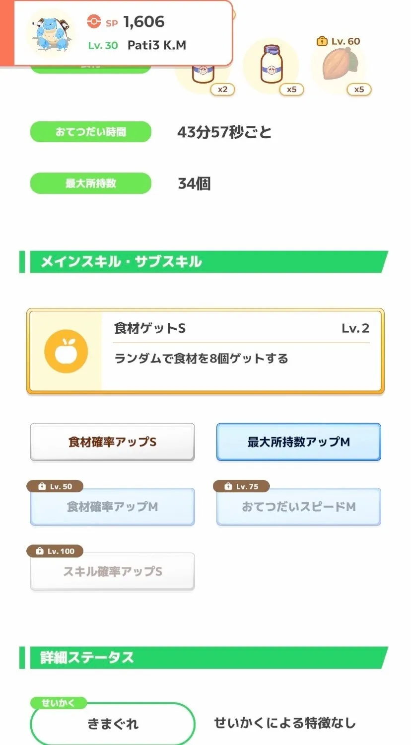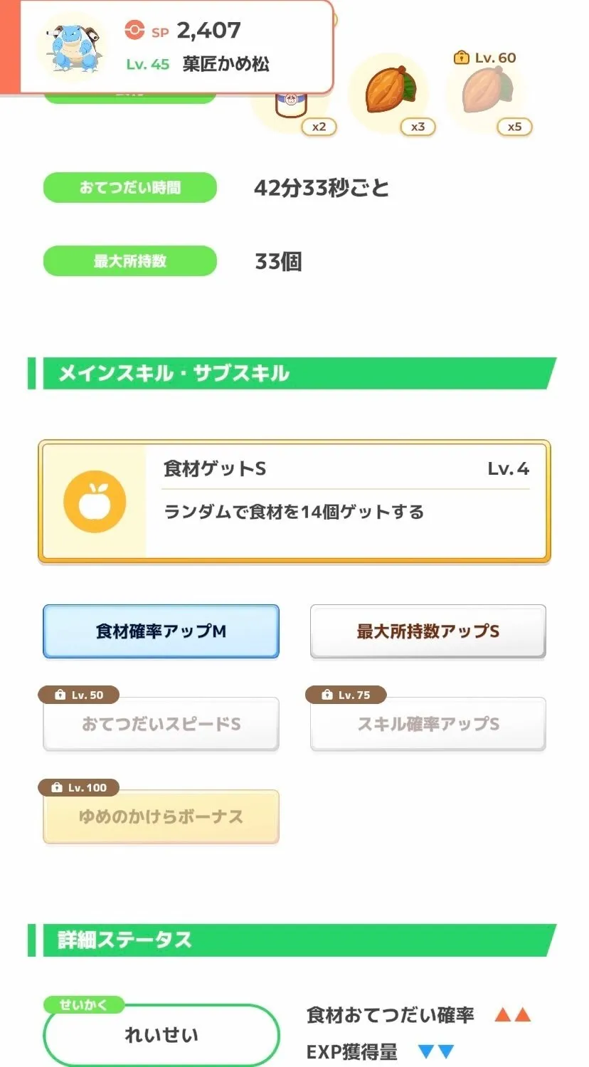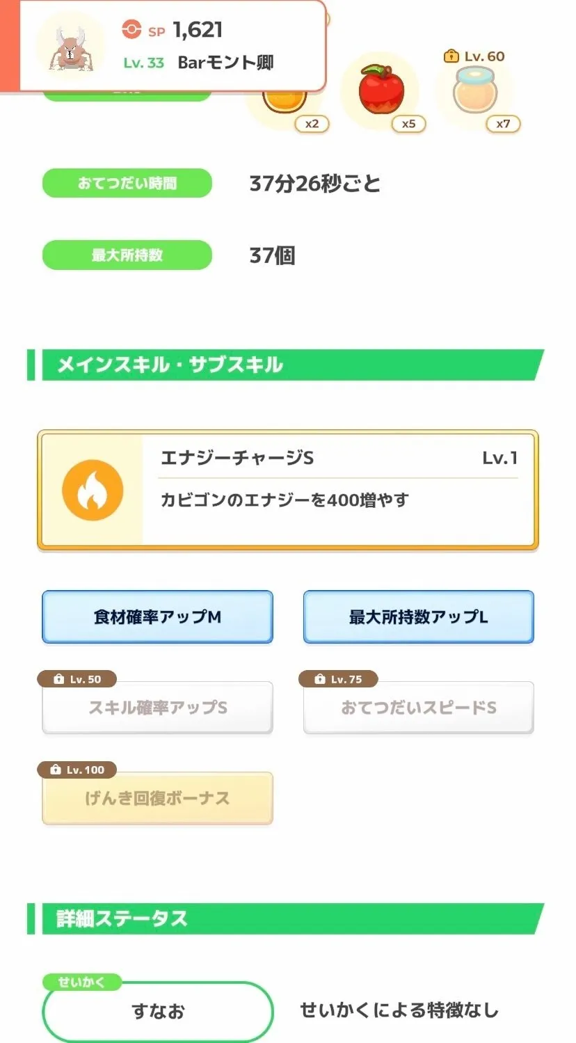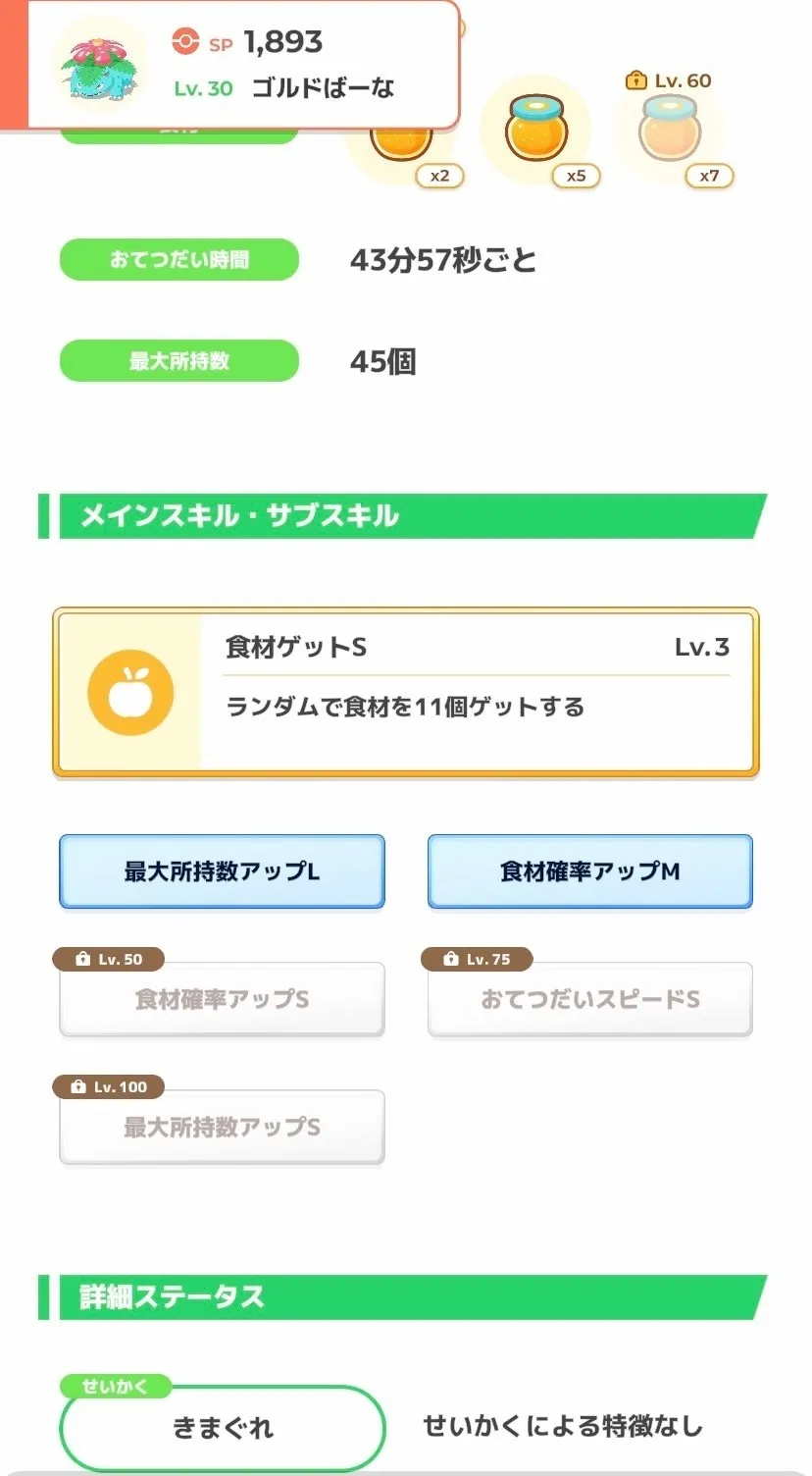 また、食材の基礎エナジーが低いものが多くエナジーがなかなか伸びない上、要求される素材数のバランスが悪いため、ハズレ週だと思う方も多いと思います。 あと最適編成を組もうとするとアブソル、カイロス、デリバードとレアポケも要求される。しかも割と厳選基準が高い。