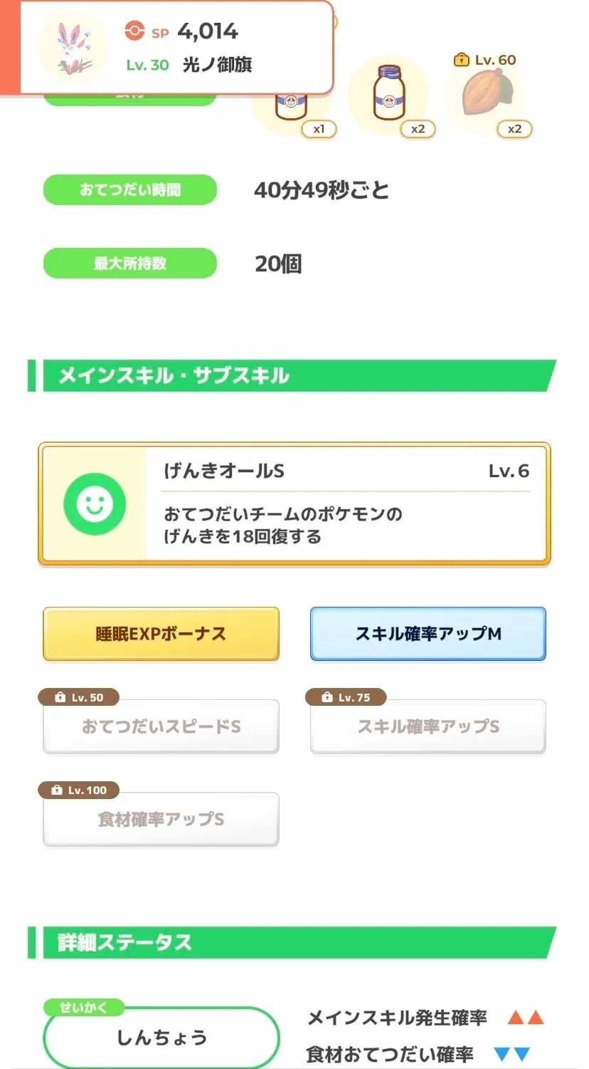 キャンチケを使わない場合日曜日しか作れないし、ここまで来るとエナジー稼ぎはそこまで重要ではないのもあり、割り切って特化編成に。 タマゴの期待値が足りないのでストックが無ければ2食が限界かと思います。 カイロスとフシギバナ、カメックスを入れ替えつつ足りない食材を補う形になると思いますが、1週間かけてリンゴとミルクの貯蓄を作れれば他のタマゴ要員を入れることも可能になりますので、3食も可能かと思います。 まあこの編成のミソはげんき維持してレシピレベル上げつつ、育成パに経験値を割り振る所にありますので…。 ニンフィアさんプクリンさん、次回からもお願いしますよ?