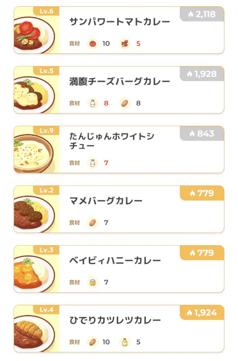 団扇のタイミングが何よりも大切!と言われていますが、個人的に何よりもまずはこれが1番大切だと思いました。レシピレベルは料理アイコンの右上に、料理エナジー量は各メニューの左側に記載してあります。