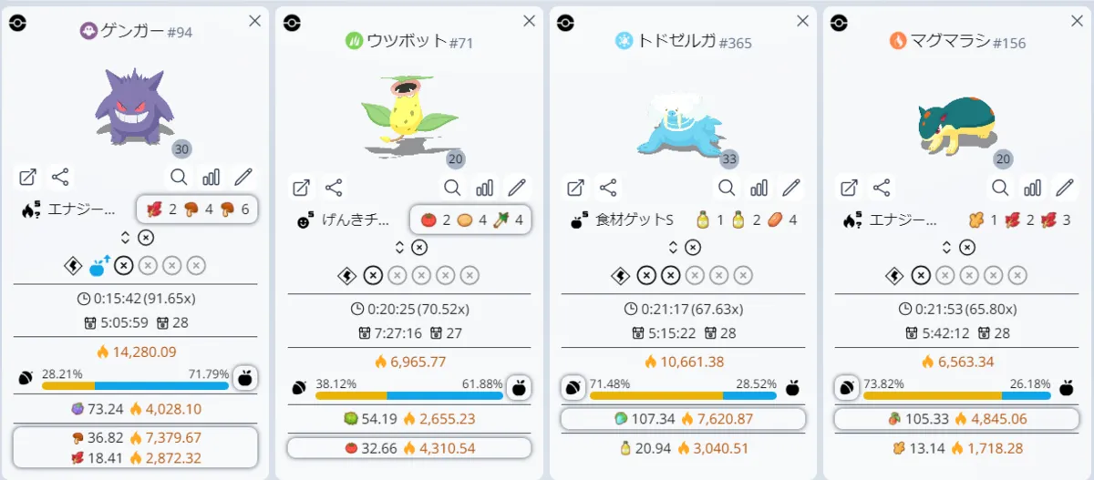 効率を極限まで求めるなら食材タイプのポケモンで固めるべきなのですが、そうすると今度はきのみのエナジーが稼げなくなります。なのでそのバランスをうまくとろうとした結果がこれ。 ※逆にがちがちに食材タイプで固めるならこうなる、の記事。 www.fireyoshida.com また、食材タイプのポケモンを一定時間雇用し昼寝してげんき回復、その後きのみタイプと入れ替えて夜寝て朝起きるまで雇用。げんきが回復したらまた食材タイプに・・・というやり方もあるのですが、めんどくね?(本音)。誰しもが脳死で作れるチームこそ世に求められている、そうは思いませんか? 先日どこかで見たのですが、ウノハナ雪原を解放しているプレイヤーはおおよそ半数ほどだそうで。世のプレイヤーは思った以上にまったりこのゲームを遊んでいます。顔真っ赤にして分割睡眠とか厳選とか課金とかしている人なんて少数派なのです。大多数の人は脳死で効率よく攻略できるチームを求めている、というのが私の考え。 メンバー的にも厳選や育成が困難だったり、汎用性が低いポケモンは選んでいません。みんないずれは育成するであろうポケモンで固めてみました。