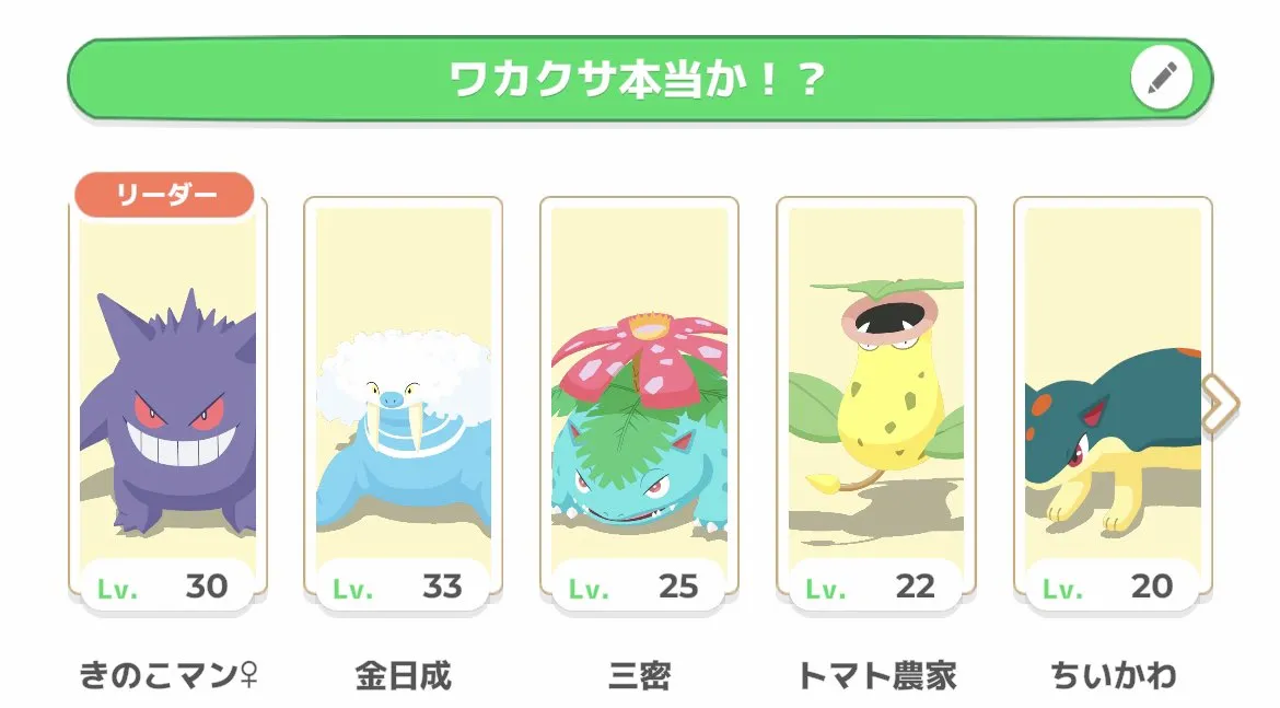 楽しい楽しいハロウィンイベントも終わり、さて今週どう過ごそうかと悩んでいた方も多かったのではないでしょうか。 私は引き続きワカクサ本島に滞在をして、すやすやとうとうとを交互に出す週にしました。すやすやではヒトカゲやピカチュウ、うとうとではチコリータやデルビル、カゲボウズが欲しいんじゃ~。 そんな私に訪れた試練がこちら・・・。 よろしくしたくない 地獄のメンバー うーん(心停止) 朝5時にカビゴンに晩ご飯をあげようと必死に起きたぼくへの仕打ちがこれ。なんということでしょう。好みのきのみを集めるきのみタイプがまったくいません。チコリータがいるじゃないかなんて声が聞こえてきそうですが、こいつはおてつ…