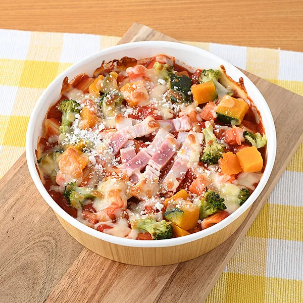 緑黄色野菜を具材に使用した、ペンネ入りのトマトグラタンです。緑黄色野菜(ブロッコリー・人参・かぼちゃ)・ベーコン・チーズがトッピングされています。おいしく野菜を摂れそうです!