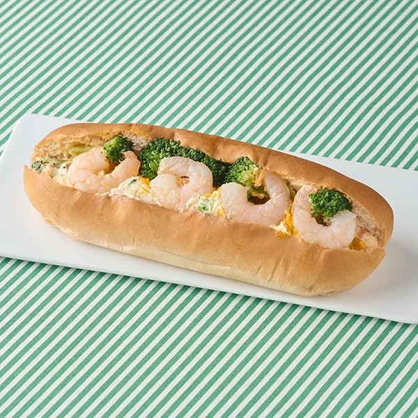海老とブロッコリーとたまごサラダを組合わせたロールパンです。見た目にも鮮やかでおいしそう!