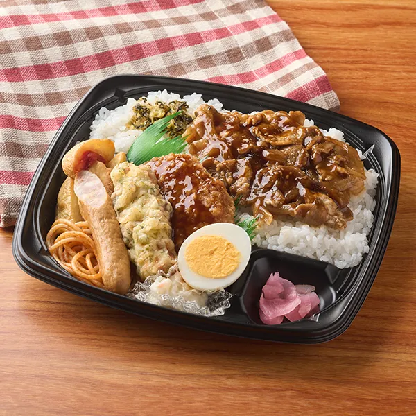 ごはんの上にコチュジャンとりんご果汁などを使用した甘辛いタレで味付けした豚焼肉をのせ、メンチカツ・ウインナー・ゆで卵など色々なおかずを盛り付けたお弁当です。おなかすいた〜! そんな時にピッタリ!