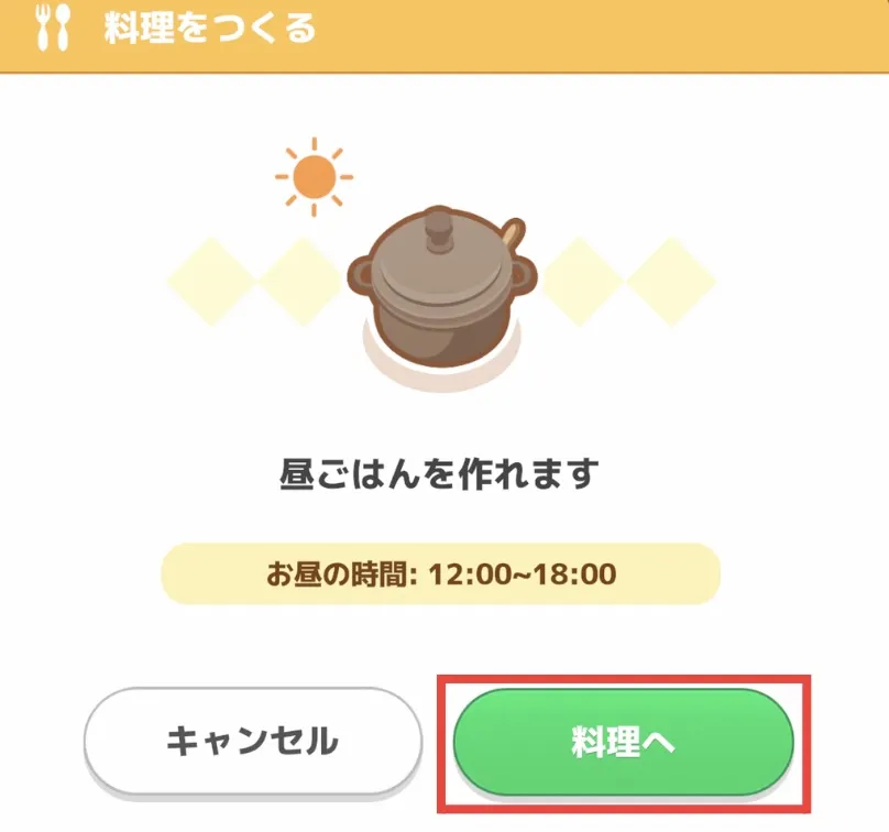 カビゴンをタップすると下記の画面が表示されるので、「料理へ」を選択して次の画面に進んでください。