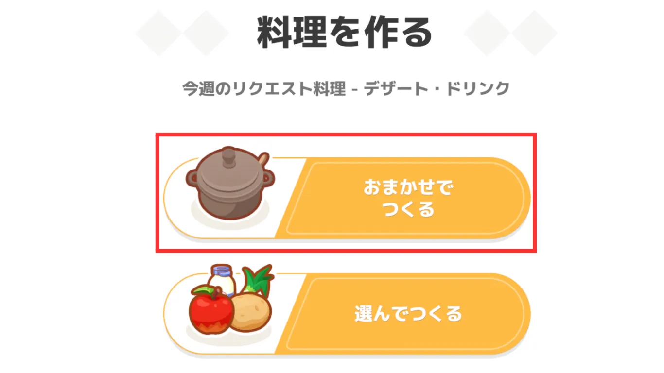 ポケモンスリープをはじめたばかりのころは「選んでつくる」で料理が作れないので、寝顔図鑑が12種類集まるまでは「おまかせでつくる」を選択しましょう。