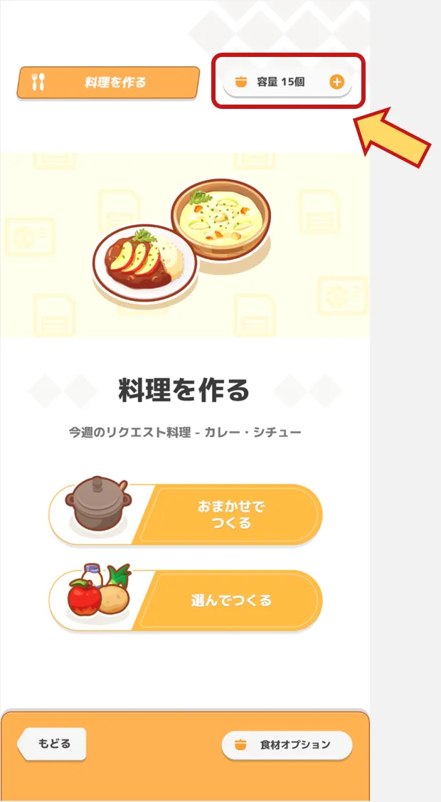 | また、料理の画面でも右上の「容量○○個」をタップすると、同様に最大容量を増やせます。 | |