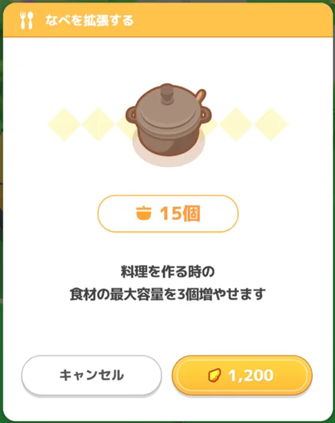 ホーム画面で「なべ」をタップすると、「ゆめのかけら」を使って最大容量を増やすことができます。