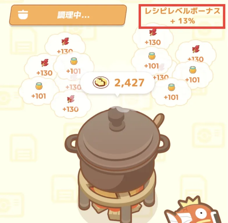 ポケモンスリープのレシピレベルボーナスは、料理をしている際の画面右上に表示されています。