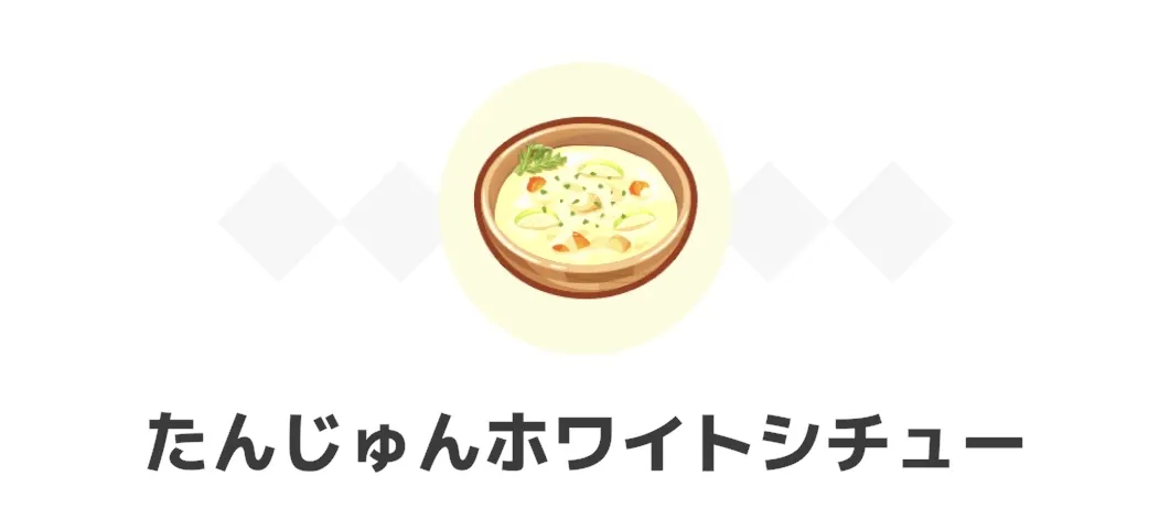 | - たんじゅんホワイトシチュー (Lv.1)のレシピエナジー:727 - とくせんりんご(追加食材):90×2 - あまいミツ(追加食材):101×3 - マメミート(追加食材):103×3 - エリアボーナス:+5% 727 + 90×2 + 101×3 + 103×3 × 1.05=1594 |