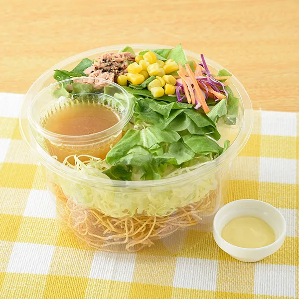 豚しゃぶをトッピングしたサラダです。3種柑橘果汁入りのポン酢付きです。 ※北海道地方、東北地方、関西地方(一部)、九州地方(一部)は仕様が異なります。 ※宮崎県、鹿児島県では取り扱いがございません。