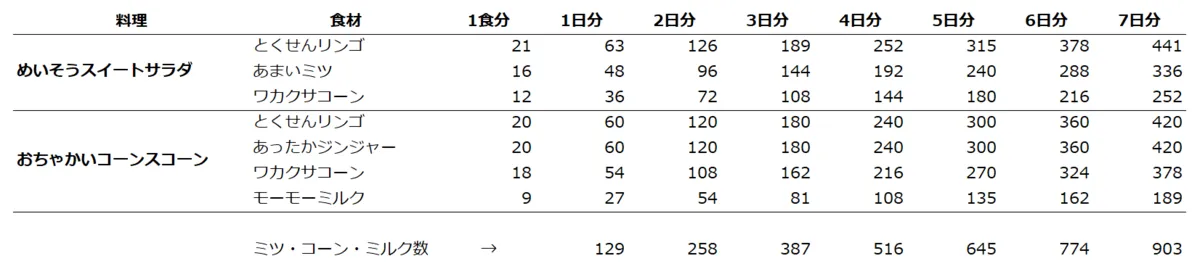 食材表 こちらの表は両料理を作るために必要な食材数を一覧化したものです。