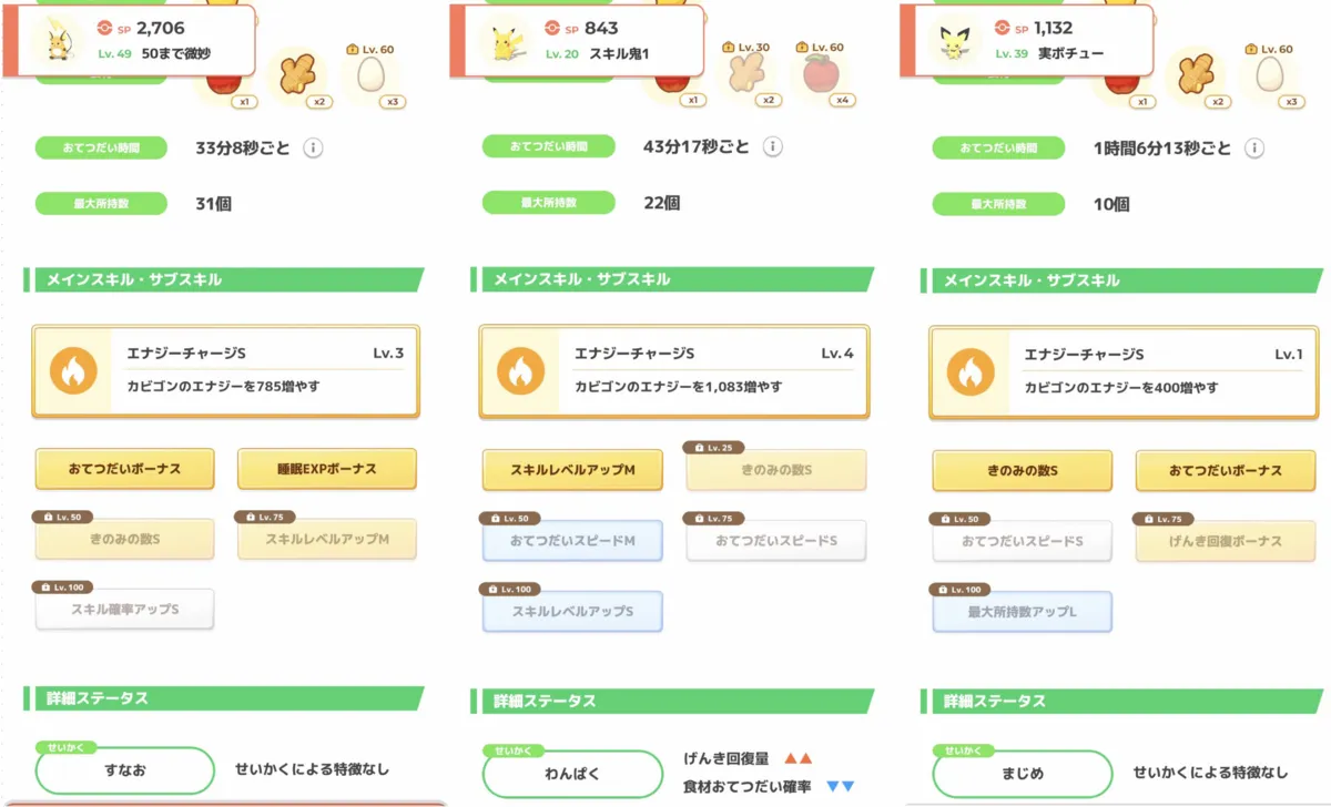 - 計:516個 では残りの84個はどうする?ですが、これはとくせんリンゴで埋めておきたい。なぜかと言いますと、私はライチュウ×3匹を編成しようとしているのですが、その3匹が毎日集める食材数は以下の通り(食材+1の補正有)でした。